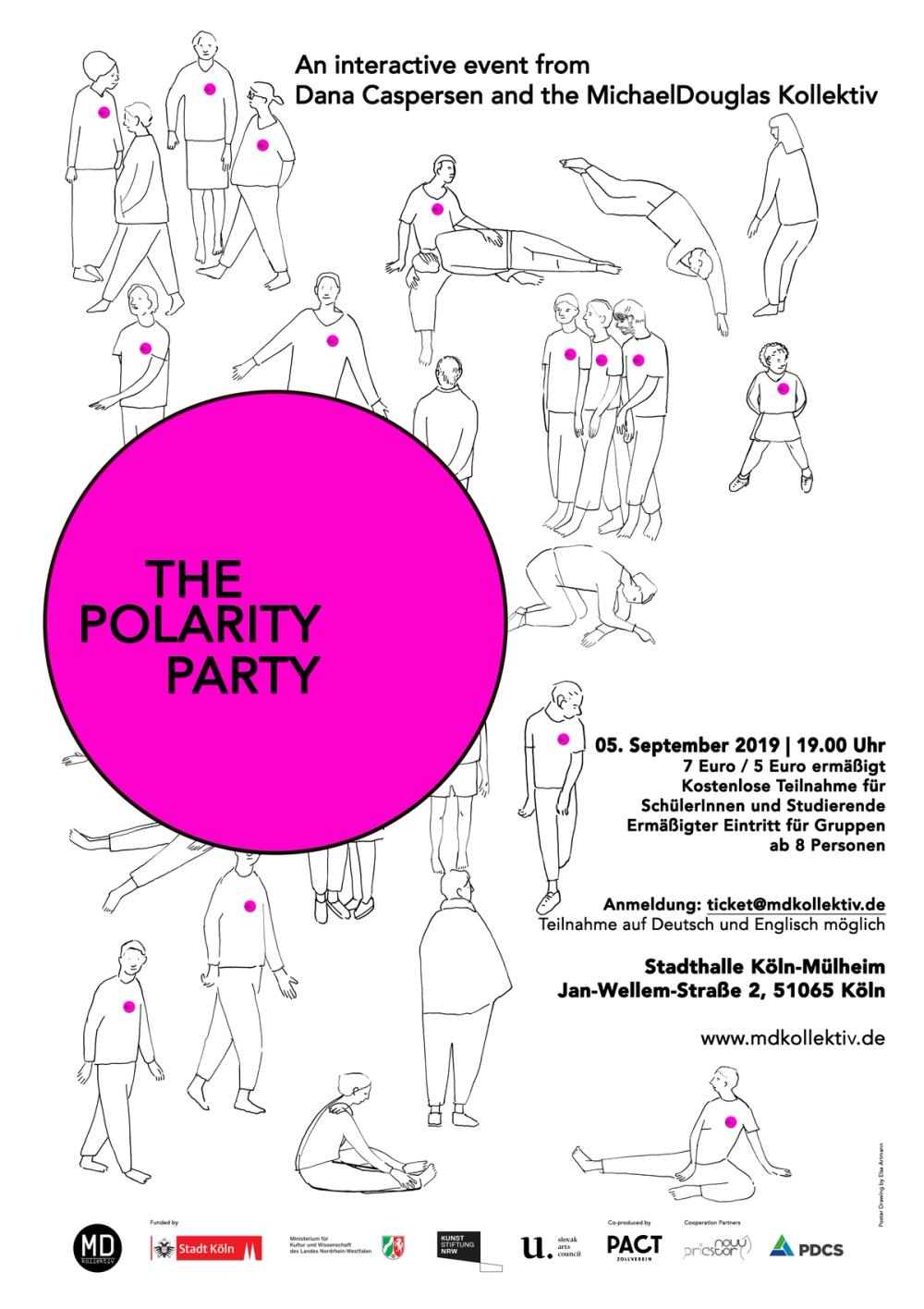 Für das MichaelDouglas-Kollektiv bedeutet Polarisierung, dass wir uns selbst als getrennt wahrnehmen und auf eine Art und Weise denken und handeln, die dieses Gefühl des Getrenntseins verstärkt oder verstärkt. Die Polarity Party integriert Praktiken aus dem Bereich der Choreografie und der Konfliktbearbeitung. Die Veranstaltung lädt die Teilnehmer zu einer sowohl intimen als auch analytischen Erfahrung ein, bei der körperliche Aktionen als Mittel zur Organisation von Ideen und zur Sichtbarmachung von Gedanken eingesetzt werden. Welche Rolle spielen wir als Individuen und Gemeinschaften in der Struktur von sozialen Verbindungen und Grenzen? Welche Mechanismen fördern oder entkräften die soziale Polarisierung?