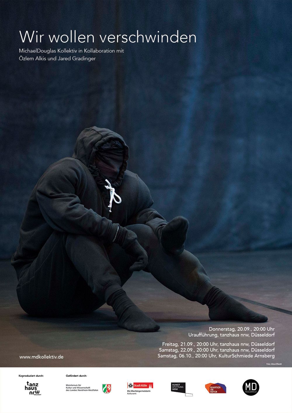 Das MichaelDouglas Kollektiv hat für WIR WOLLEN VERSCHWINDEN mit der Choreografin Özlem Alkiş deren Arbeit zu Techniken der Camouflage weiterentwickelt. Die Choreografie macht eine körperliche Kommunikationsweise produktiv, die Inspiration aus nichtmenschlichen, organischen und instinktiven Prozessen schöpft. Der Komponist Tian Rotteveel kreiert eine Klangkulisse, die Ton, Bewegung und Raum verbindet. Der Tanzkünstler Jared Gradinger lud die Darsteller*innen ein, sich mit ihrem eigenen Schattenselbst zu beschäftigen. Als wesentlicher Teil des Recherche- und Entwicklungsprozesses wurden die Mitglieder des Kollektivs dafür von Jared Gradinger einzeln in Hypnose versetzt. Mit Hilfe von Hypnose erforschten sie ihr verborgenes Selbst.